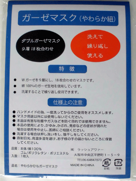 ◇ 商品情報 ●Wガーゼを9層使用し、18枚合わせのマスクです。