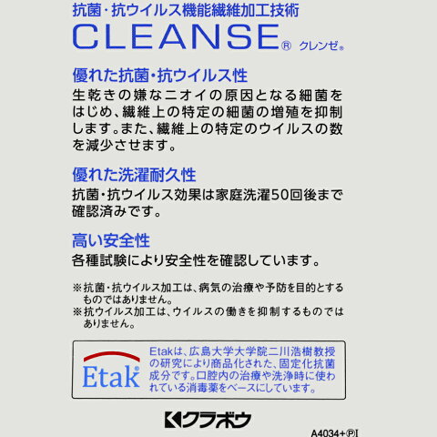 使いやすい配色の全7色展開です! 抗菌・抗ウイルス機能繊維加工技術「クレンゼ」に新型コロナウイルスを99%以上減少させる効果があると発表がありました 特長 ●優れた抗菌・抗ウイルス性=約20種類の微生物(細菌・真菌・ウイルス)に対する繊維上での効果を確認しています。