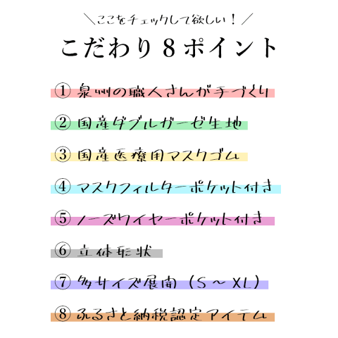 ▼衛生用品につき商品到着後の「キャンセル・交換・返品は不可」とさせていただきます商品説明 当店がある南大阪の泉州地区は昔から繊維産業が盛んな地域。